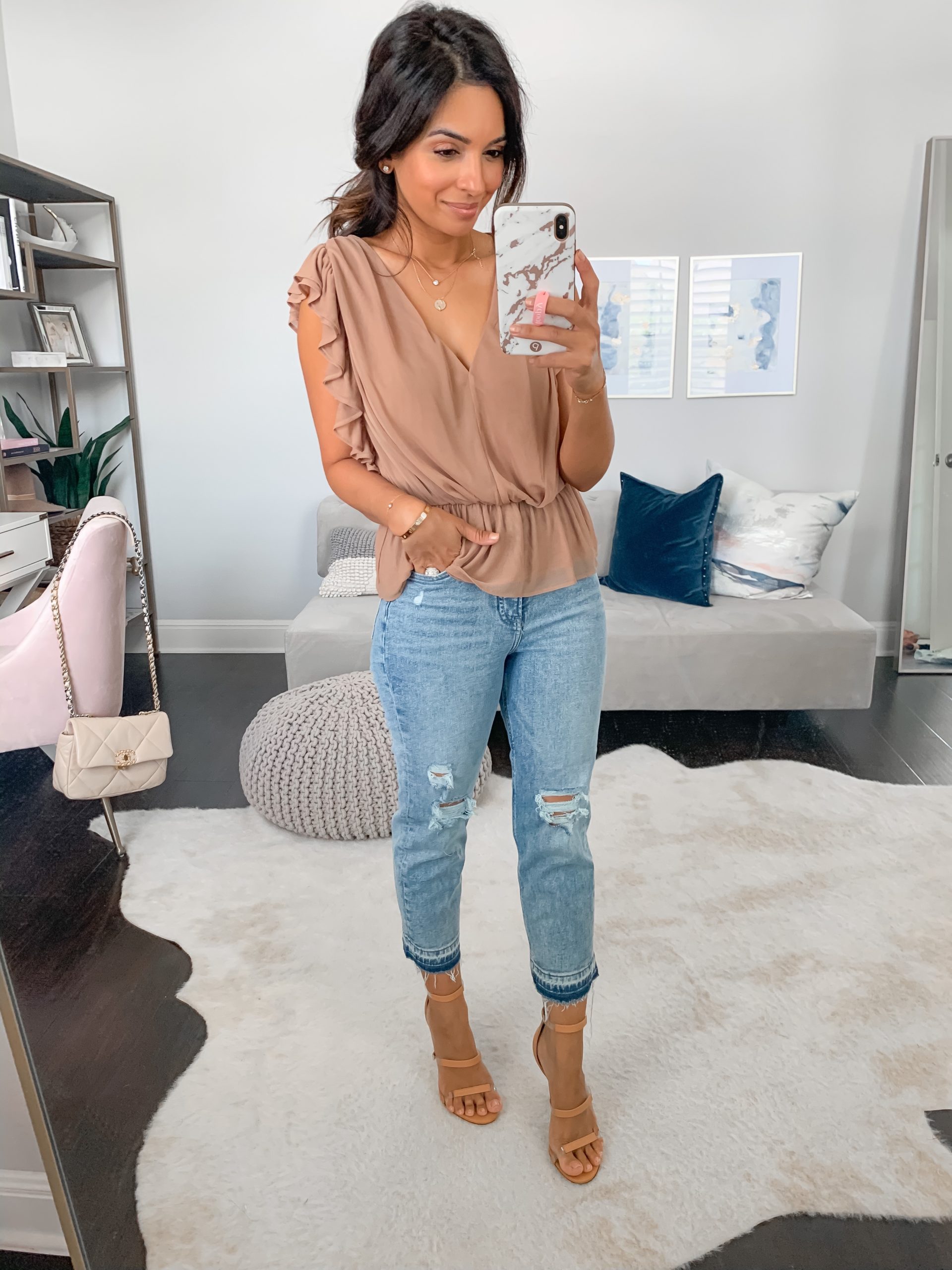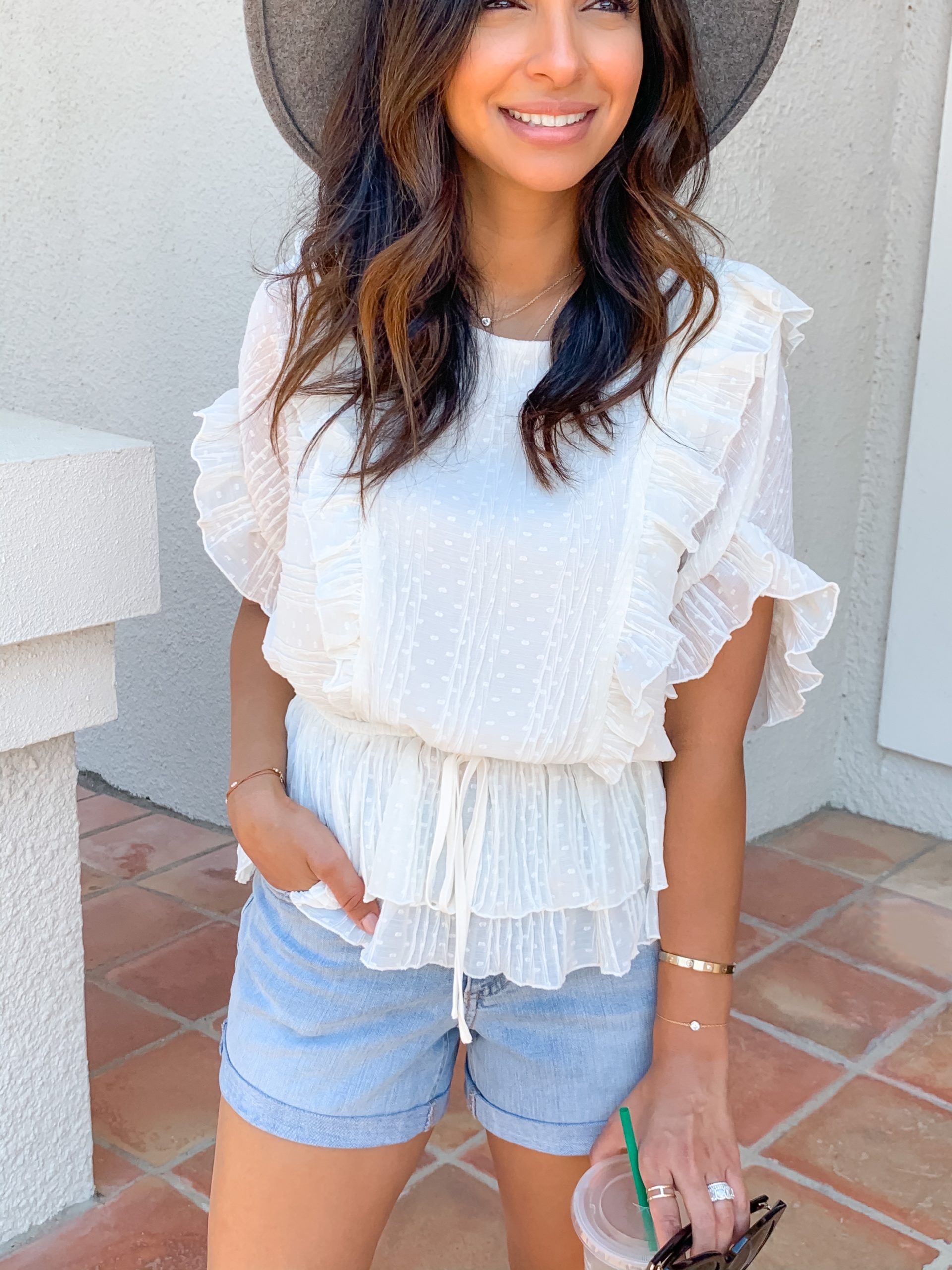 I have been loving all of the pretty romantic, feminine pieces at Express. They have lots of girly tops that you can easily dress up or down and transition into fall.   This peplum top is so chic and flowy with such pretty detail. I paired it with shorts but also can’t wait to dress it up with some denim and heels for date night.