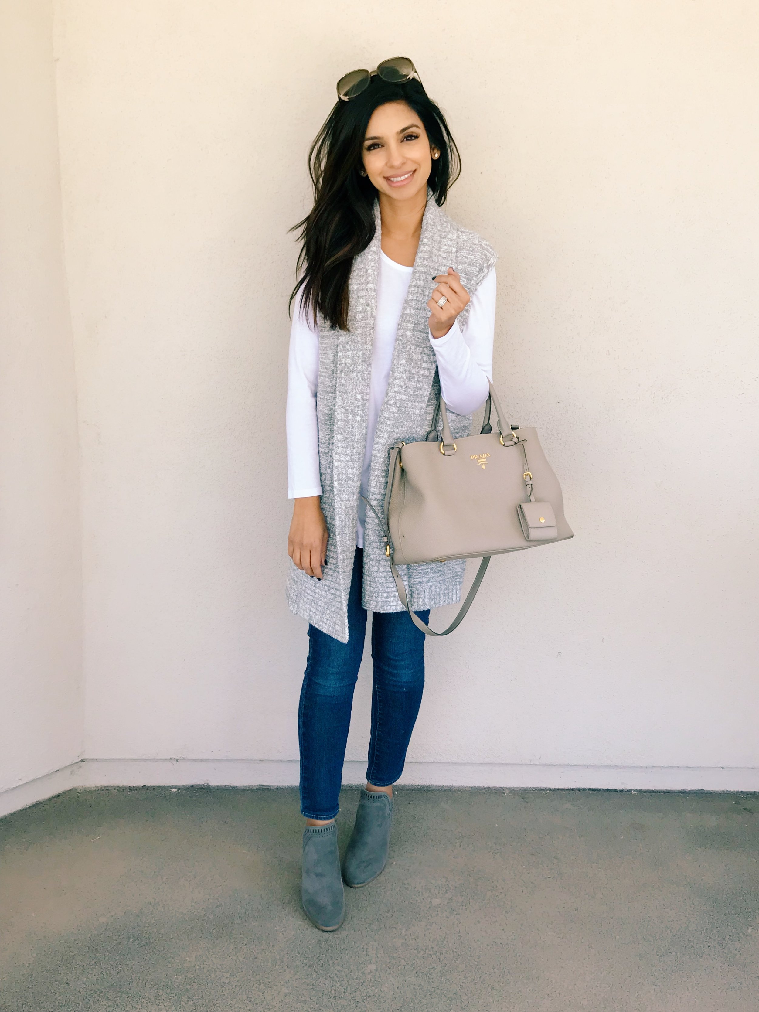 I’ve also worn this tucked in and I’ll soon be sharing more looks on how I’ve styled it. Here I wore it with one of my favorite sweater vests that is the perfect color and goes with everything. I paired it with simple skinny jeans and these gray booties which I’m obsessed with.