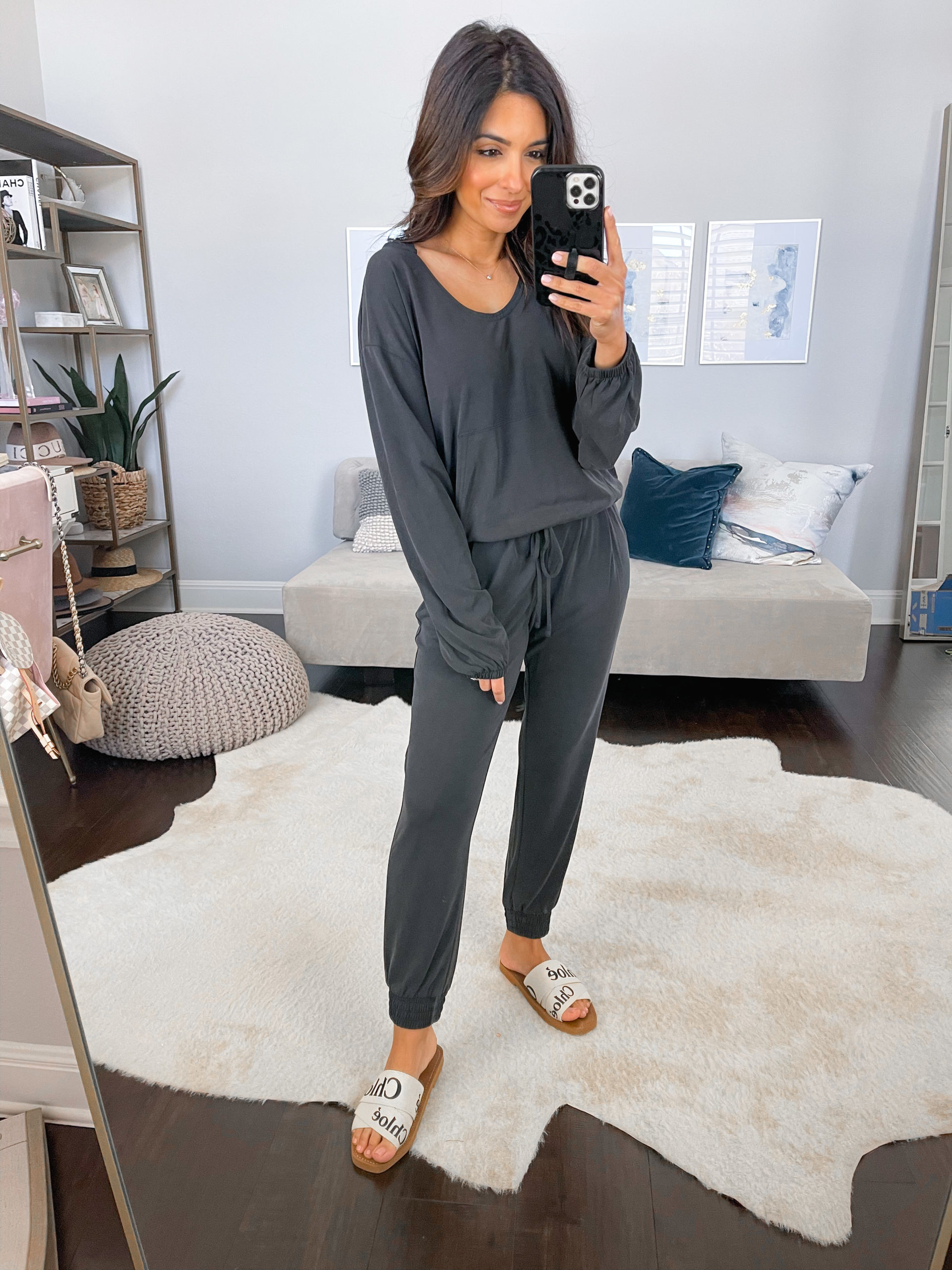 This silky sueded jersey set has been my #1 pick! I can’t rave enough about the material, it is incredibly soft, doesn’t cling to the wrong areas, & doesn’t wrinkle up when I sit! Honestly a description just doesn’t do it justice, it’s a must try!  The fit of these joggers is perfection. They’re extra high waisted & I love the elastic band at the ankle. I’d wear this for daily wear just out & about running errands, travel, loungewear, & so much more! For sizing, I have found their sets to be pretty true to size. I’ve been doing an XS in the tops & XXS in bottoms (& petite length if available).