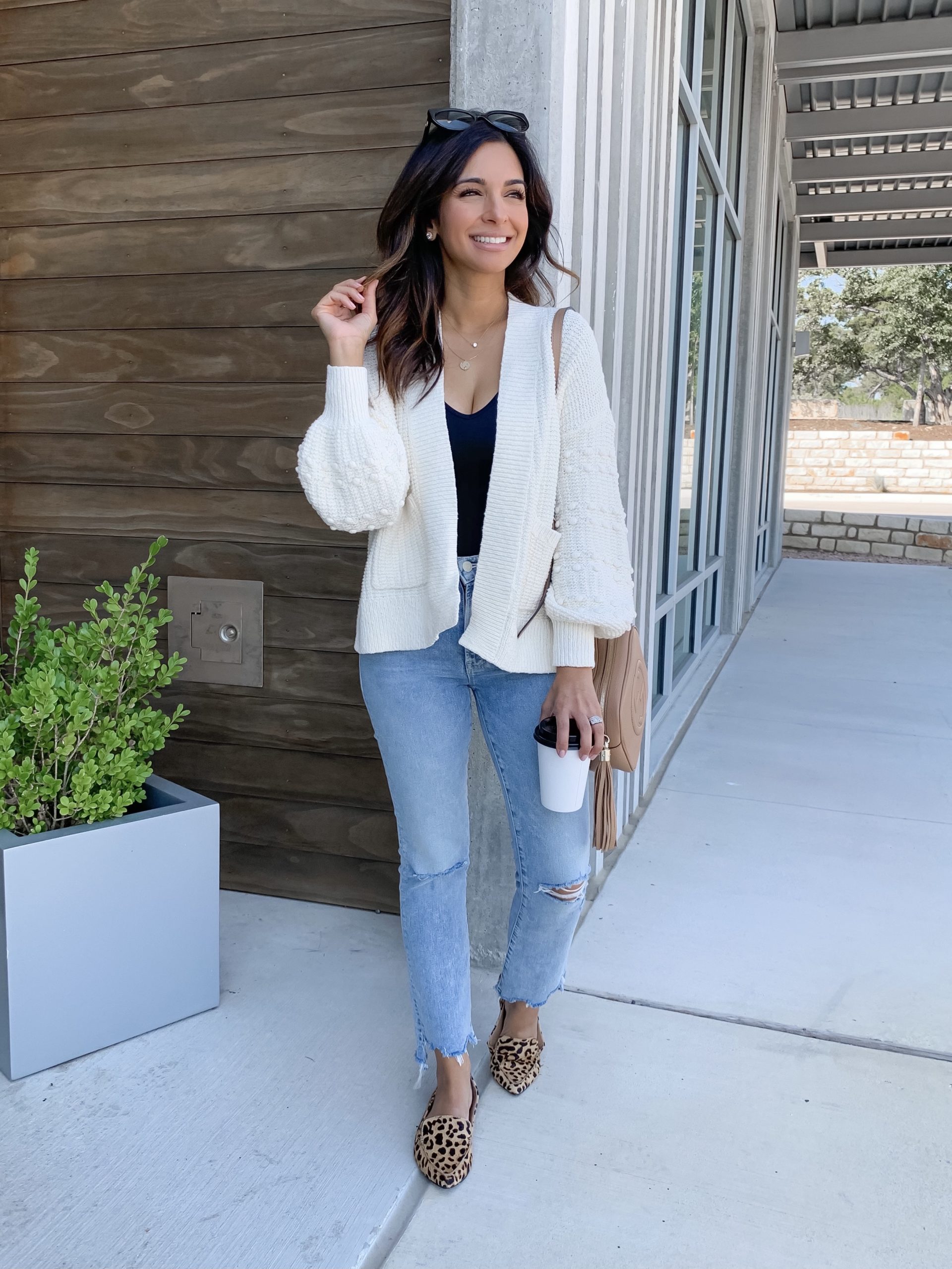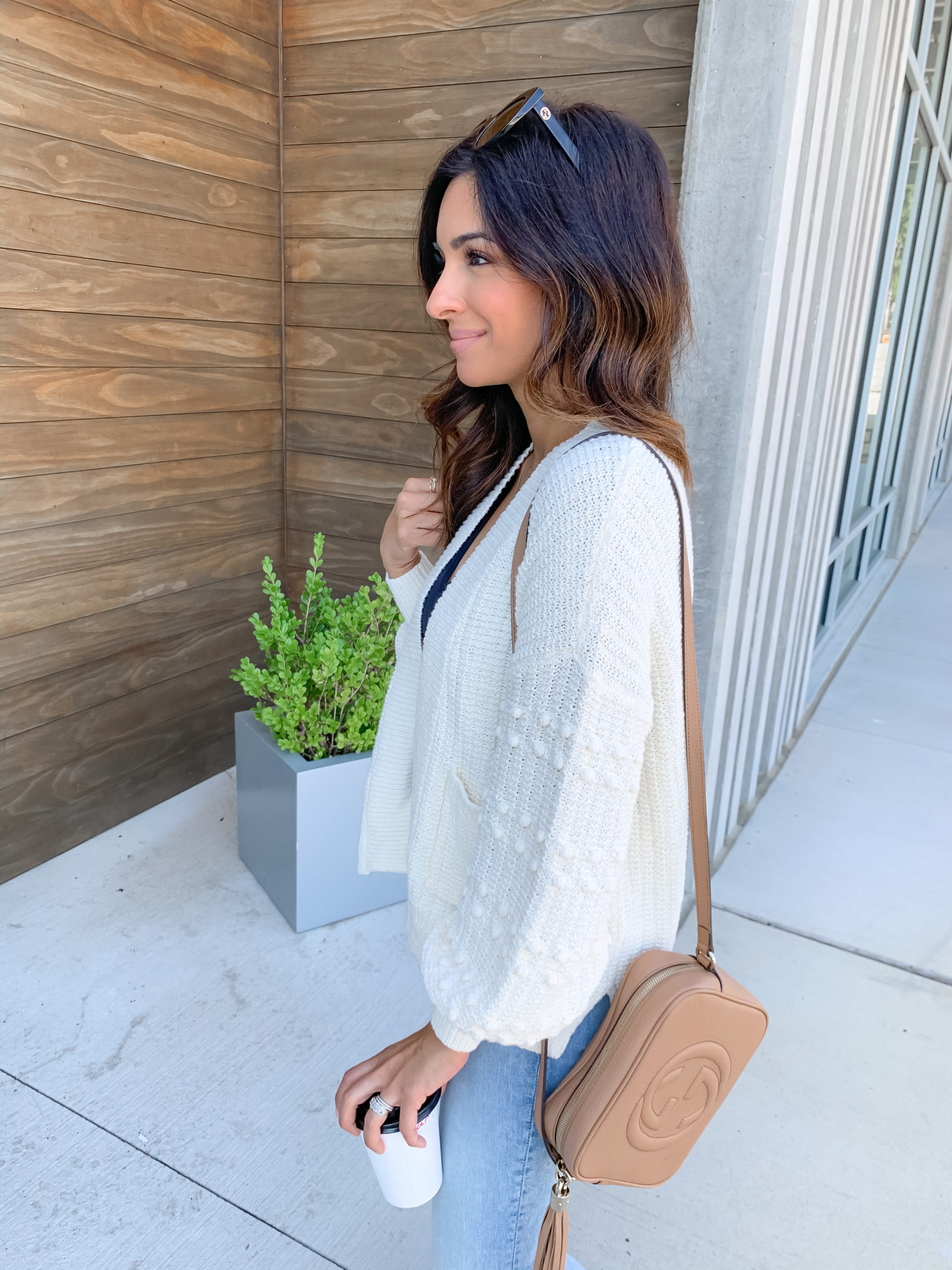 I’m always on the hunt for simple pieces I can wear throughout this season. I have been living in these jeans lately and although they’re a splurge, the quality and fit are amazing. This cardigan is such a good fall staple. It’s so cozy and has the cutest little twist to it with the pom detail. It’ll be so fun to continue to wear into the holidays and can be dressed up, too!
