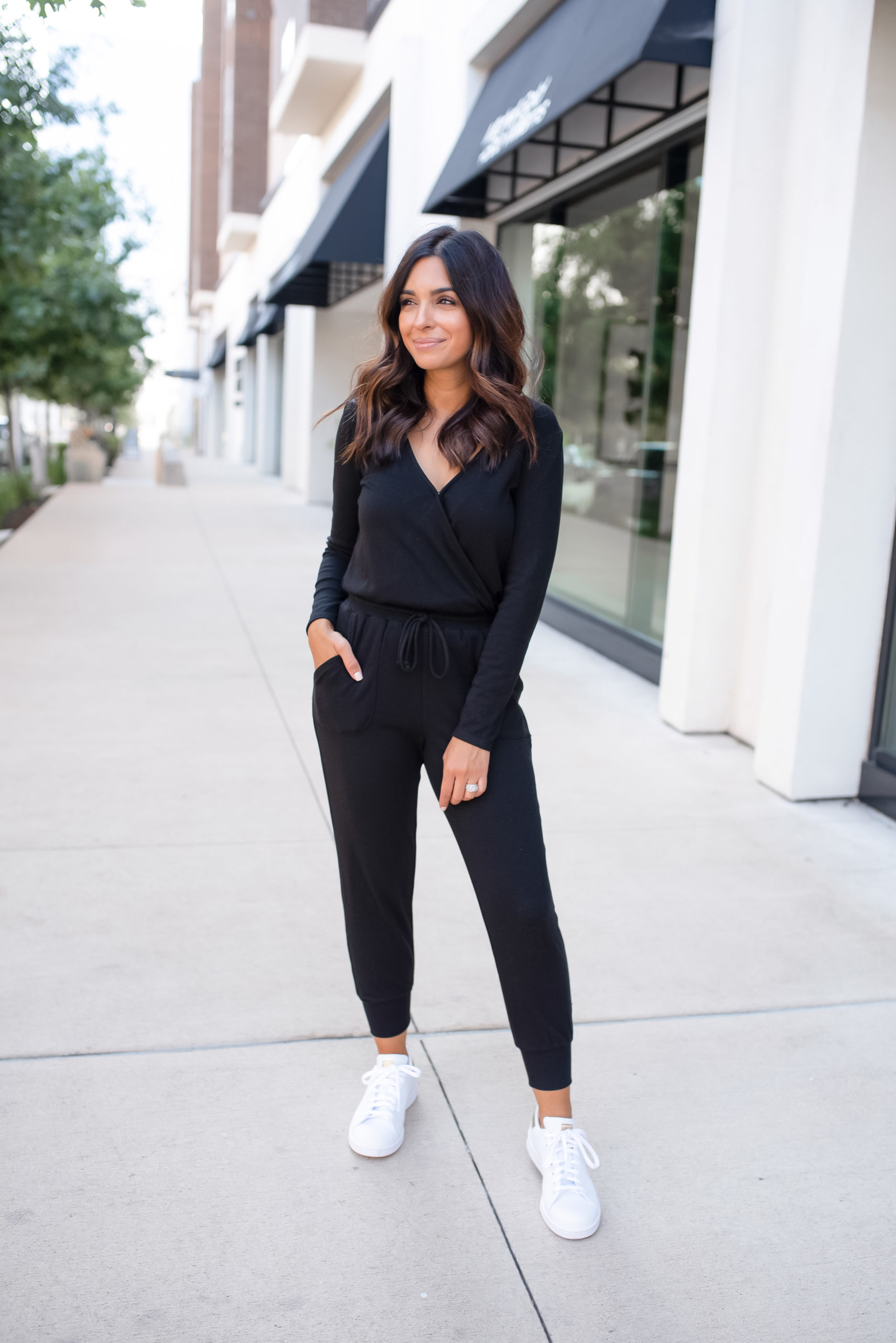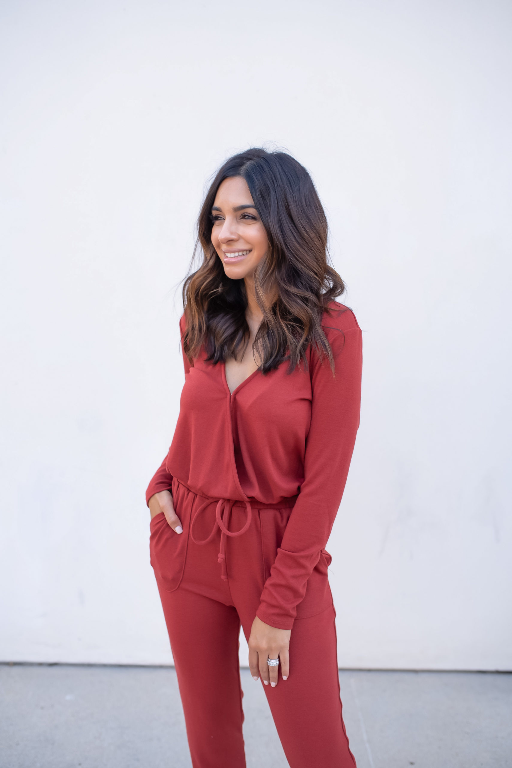 We all love a good jumpsuit and I couldn’t wait to share this long sleeved one with you girls for fall and winter! It’s such an easy piece to wear on repeat and look and feel put together while still being comfy.The neckline is super flattering and it’s perfect for a day of travel or running errands. This will be a go-to for me this season! It’s available in two colors – black & ginger. I’m wearing the XS petite. You can shop it here!